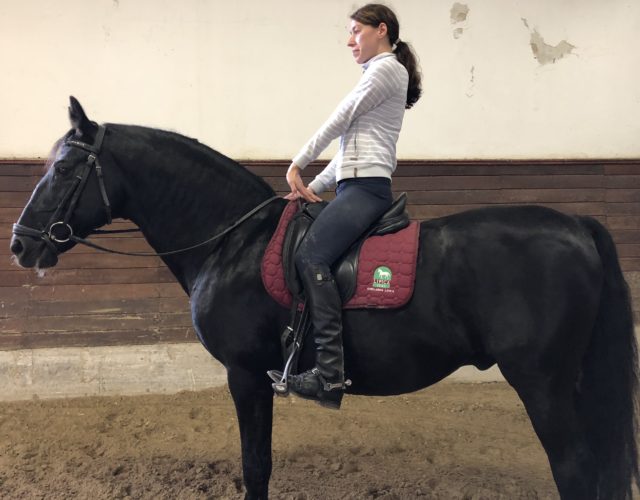 Los ejercicios que os dejo, son para ser introducidos en una sesión ordinaria con vuestros caballos, aprovechando los momentos en los que tengamos que ceder rienda o dejar descansar al caballo para implementarlos. Primero tenemos que hacer un calentamiento, la propia sesión nos servirá como calentamiento y movilización aunque también puedes probar lo siguiente: busca el contacto del caballo durante unos 2-3 segundos y suaviza hasta que el caballo baje la cabeza, vuelve a buscar el contacto, repite el ciclo a lo largo de una vuelta a la pista ¡verás qué bonito es hacer terapia conjunta!. Repite lo mismo a la otra mano. Intenta ver este ejercicio como una forma de ganar tacto y de relajar el cuello de tu caballo, preparándolo para los siguientes ejercicios: